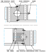 這種開式裝配非常方便,上下圓弧滾道的承載角都為90°,能承受很大的軸向力和傾翻力矩。當(dāng)徑向力大于0.1倍的軸向力時(shí)滾道須特殊設(shè)計(jì)。雙排球式回轉(zhuǎn)支承的軸向、徑向尺寸都比較大,結(jié)構(gòu)堅(jiān)固,特別適用于要求中等以上直徑的塔式起重機(jī)、汽車起重機(jī)等裝卸機(jī)械上。